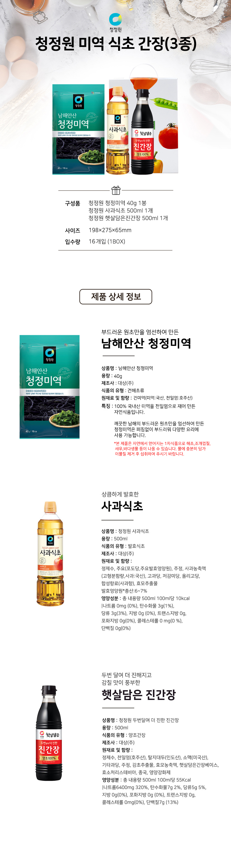 ûÁ¤¿ø ûÁ¤¹Ì¿ª 40g 1ºÀ, ûÁ¤¿ø »ç°ú½ÄÃÊ 500ml 1°³, ûÁ¤¿ø ÇÞ»ì´ãÀº Áø°£Àå 500ml 1°³ |